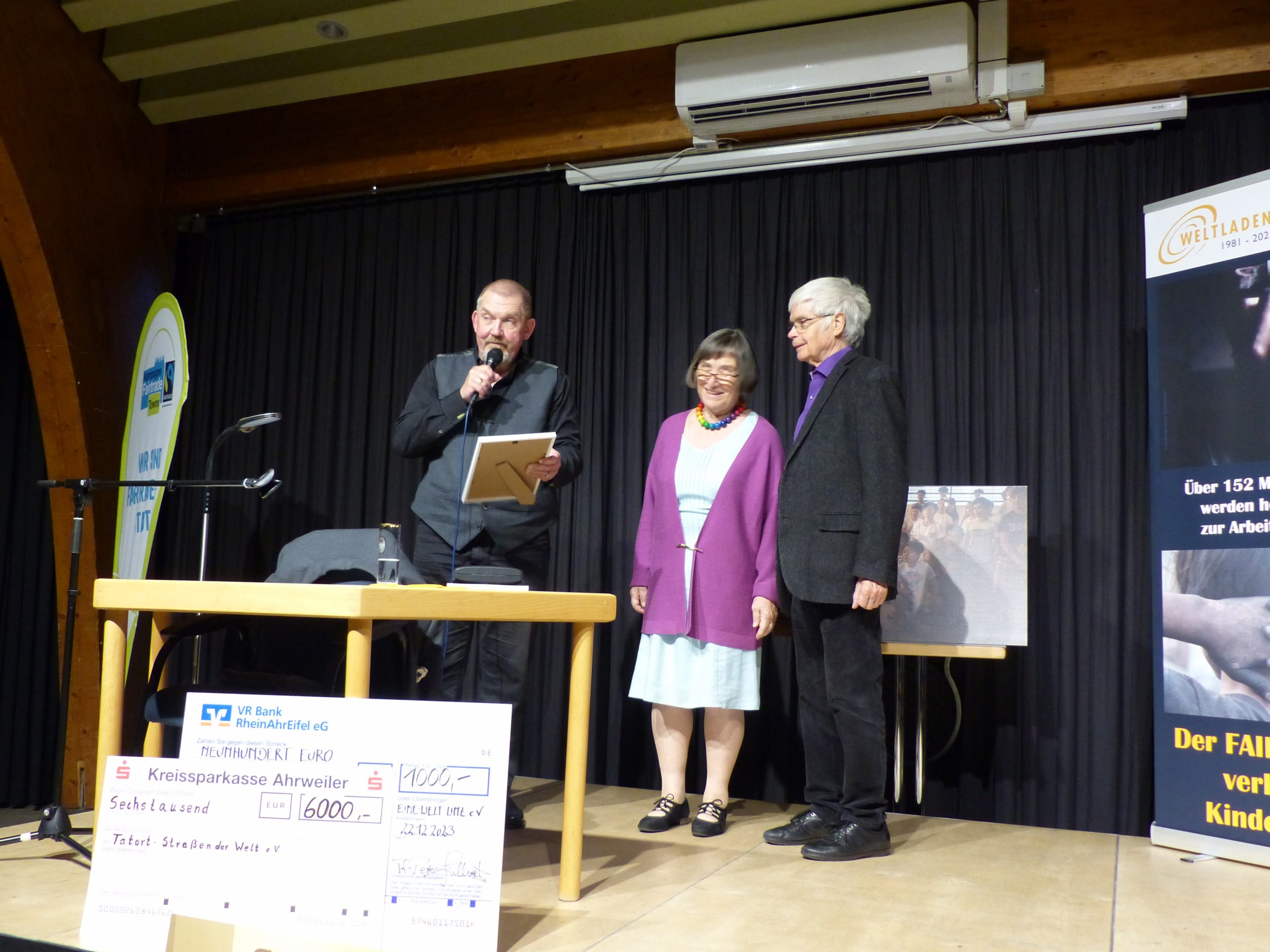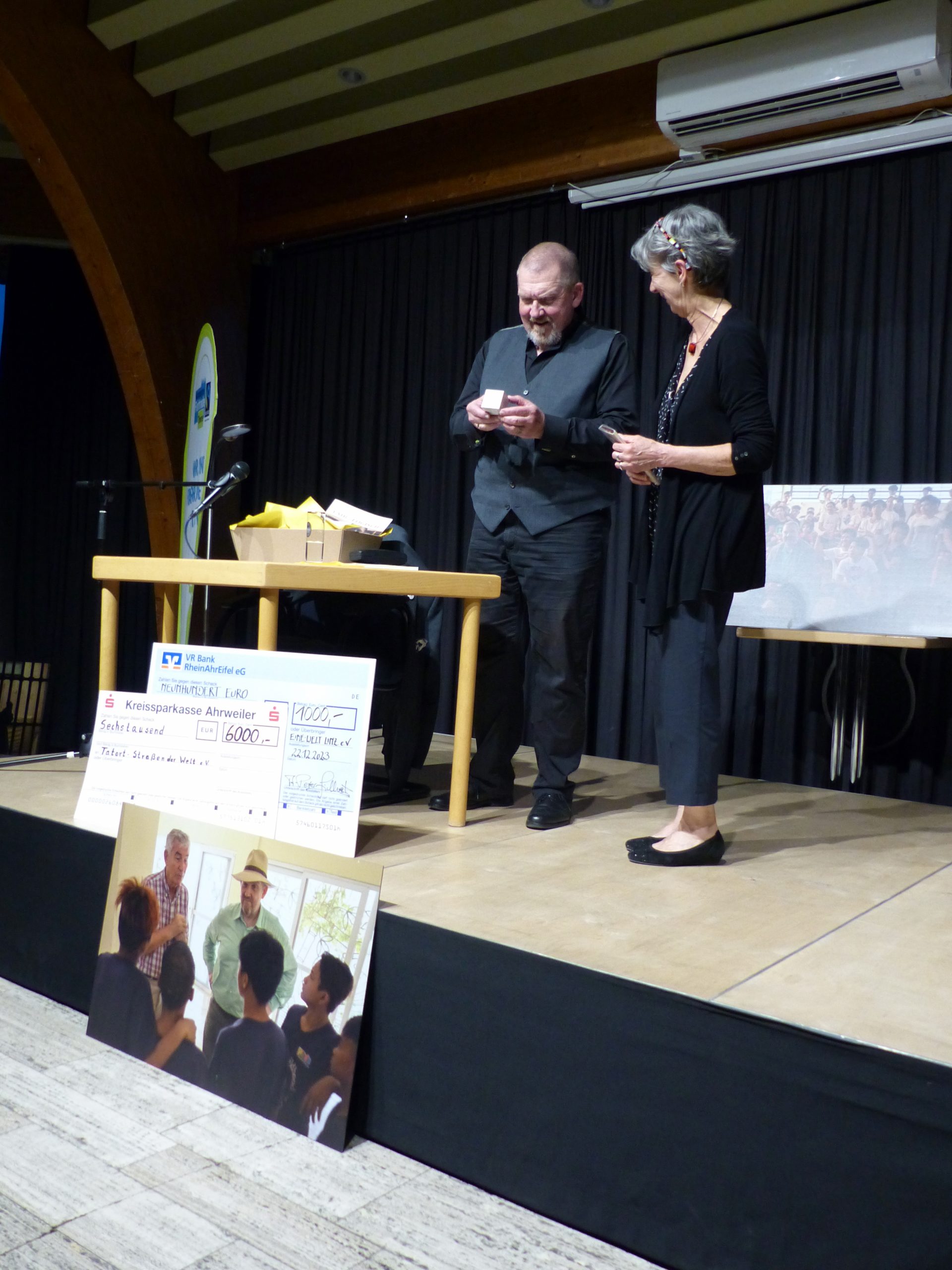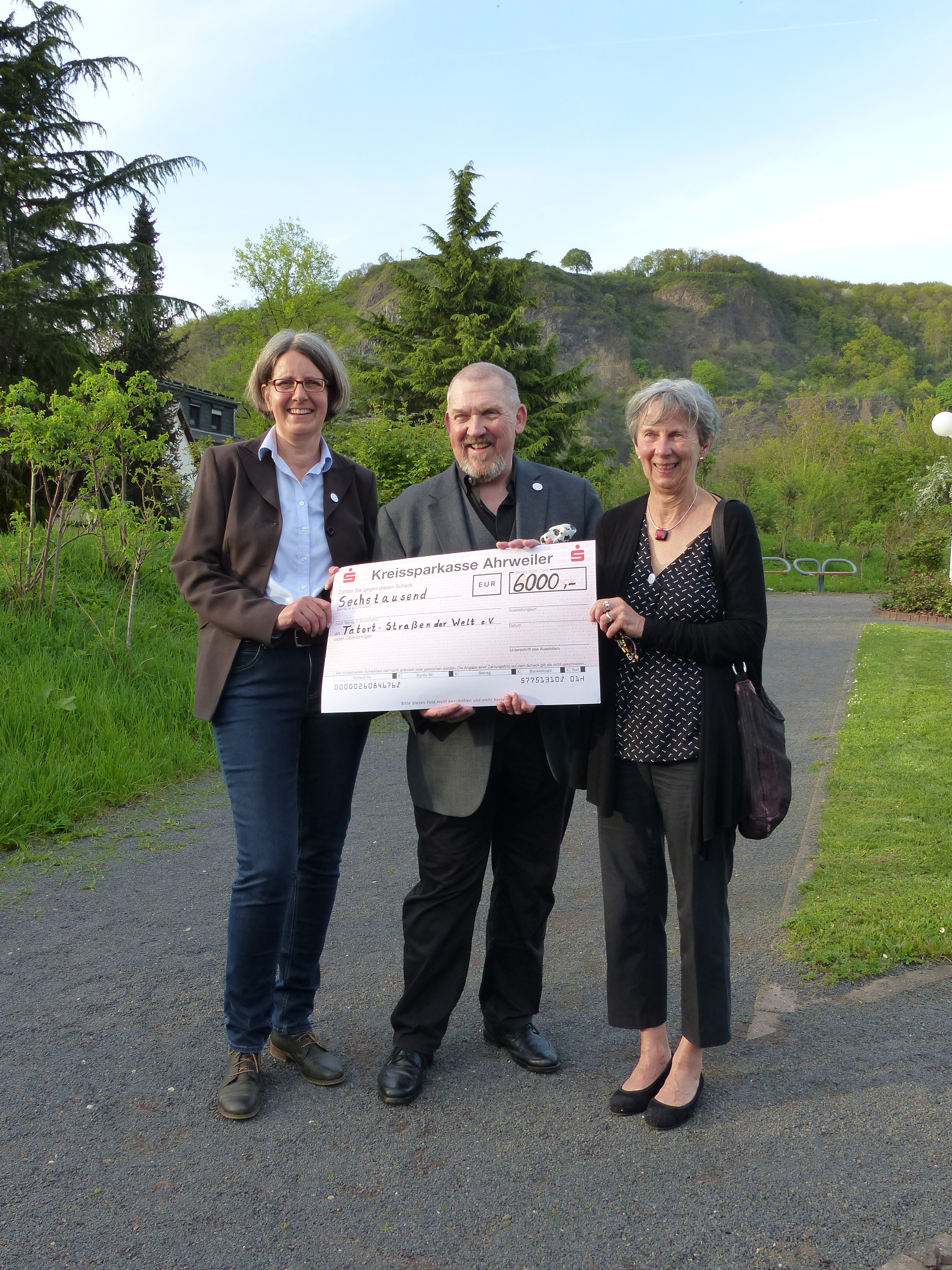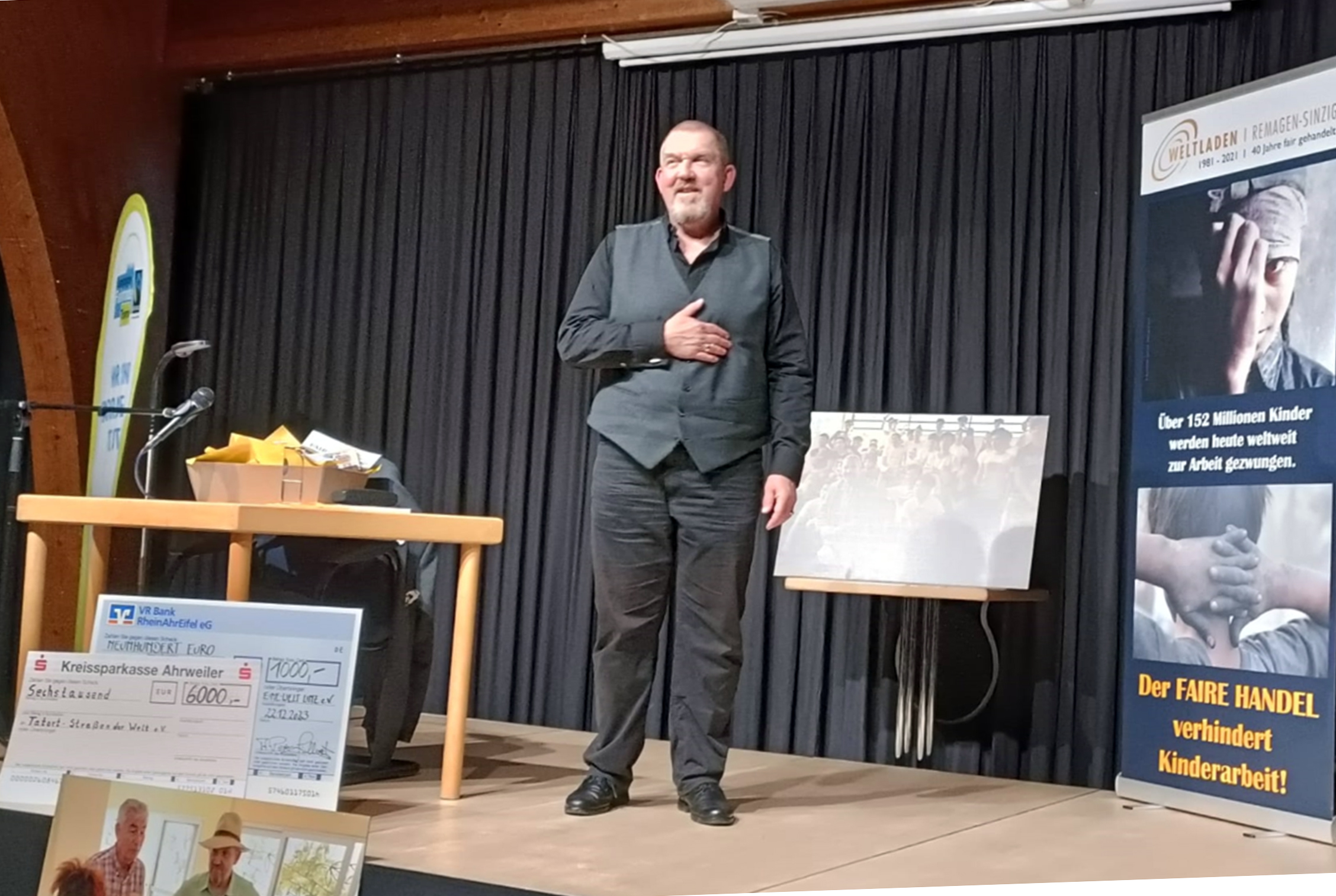 Möglich gemacht wurde dieser Abend vom Weltladen Remagen-Sinzig sowie der Fairtrade Gruppe Remagen. Nach der Lesung überreichten der Weltladen Linz, die Buchhandlung Geber und der Weltladen Remagen-Sinzig Spendenschecks für das Jubiläumsprojekt des Tatortvereins „Mango Tango“. Mehr als 7.000 Euro kamen zusammen. Dietmar Bär und der Vorstand des Vereins Tatort – Straßen der Welt e. V. freuten sich sehr über diese stattliche Summe.
