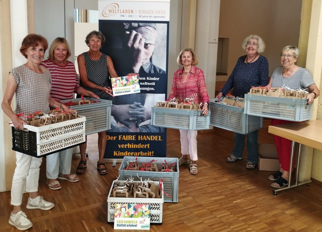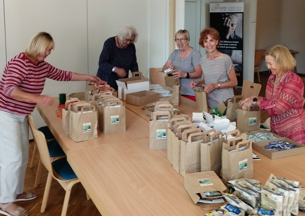 Am 12. August trafen sich Mitarbeiterinnen des Weltladenteams zum Packen von 100 fairen Schultüten, die den Schüler*innen in der nächsten Woche zum Schulstart an der IGS von der Fairtrade Stadt Remagen überreicht werden sollen.