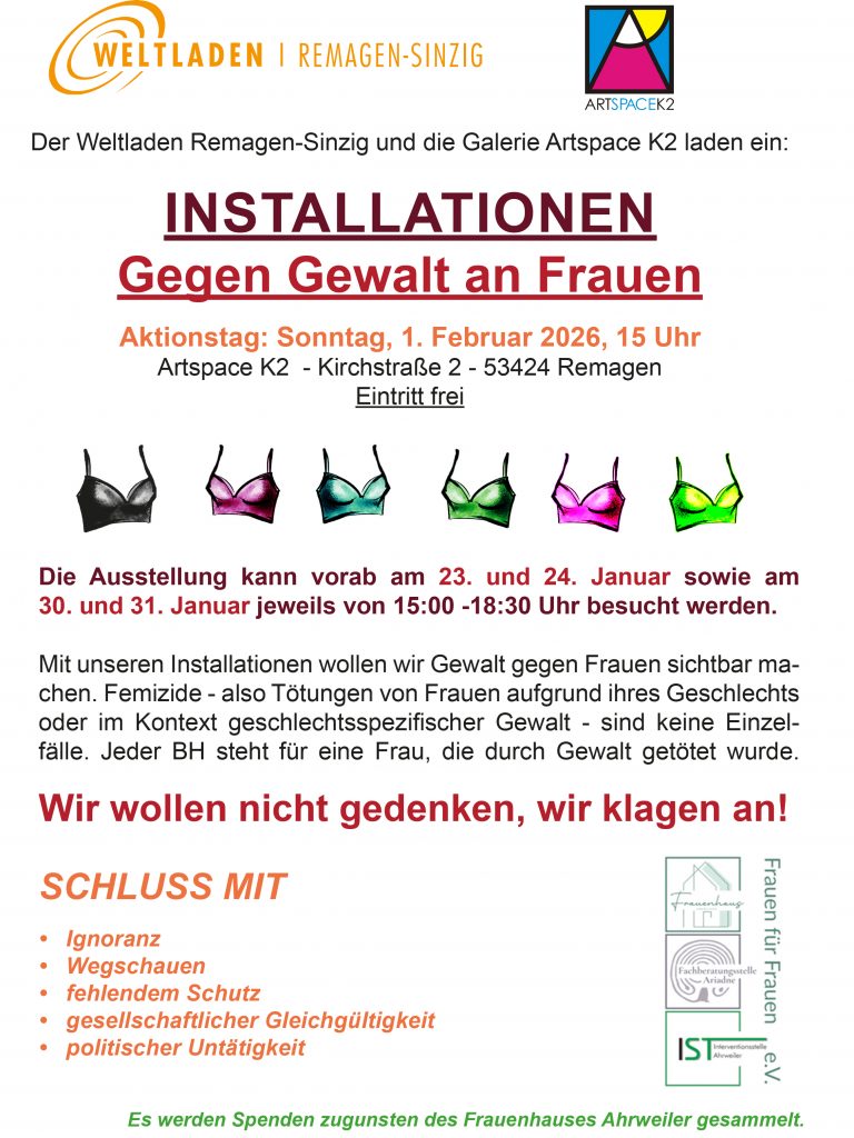 Die Installationen sollen Besucherinnen und Besucher zum Austausch und Auseinandersetzung mit diesem Thema anregen. Es werden Spenden zugunsten des Frauenhauses Ahrweiler gesammelt. Die Ausstellung kann vorab am 23. und 24. Januar sowie am 30. und 31. Januar jeweils von 15:00 -18:30 Uhr besucht werden.