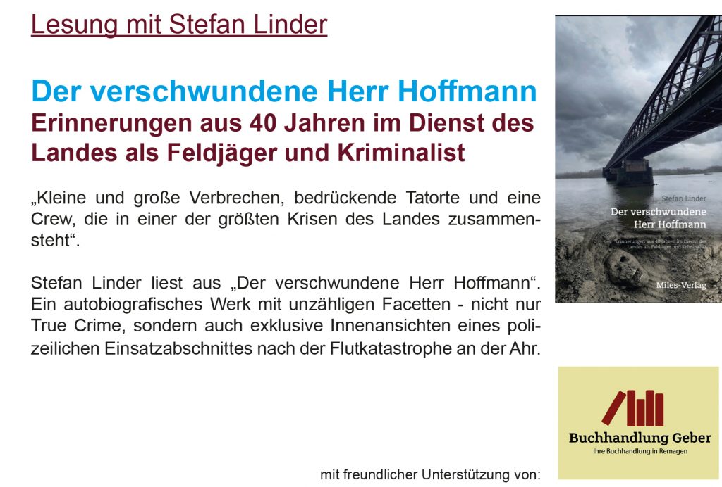 Fünf Jahre nach der verheerenden Ahrflut: Stefan Linder liest aus „Der verschwundene Herr Hoffmann“. Ein autobiografisches Werk mit unzähligen Facetten – nicht nur True Crime, sondern auch exklusive Innenansichten eines polizeilichen Einsatzabschnittes nach der Flutkatastrophe an der Ahr. „Kleine und große Verbrechen, bedrückende Tatorte und eine Crew, die in einer der größten Krisen des Landes zusammensteht“.