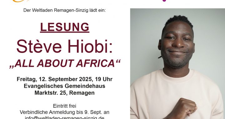 Am 12. September begrüßte das Weltladenteam den mit dem Grimme-Online-Award ausgezeichneten „Afrofluencer“ Stève Hiobi. Er las aus seinem Buch „All About Africa“ und erzählte auch viel über seine persönliche Geschichte und seiner Motivation auf Tiktok und Instagram als „deinbrudersteve“ über Afrika zu berichten. Über 120 Gäste kamen, im Saal waren alle Plätze besetzt.