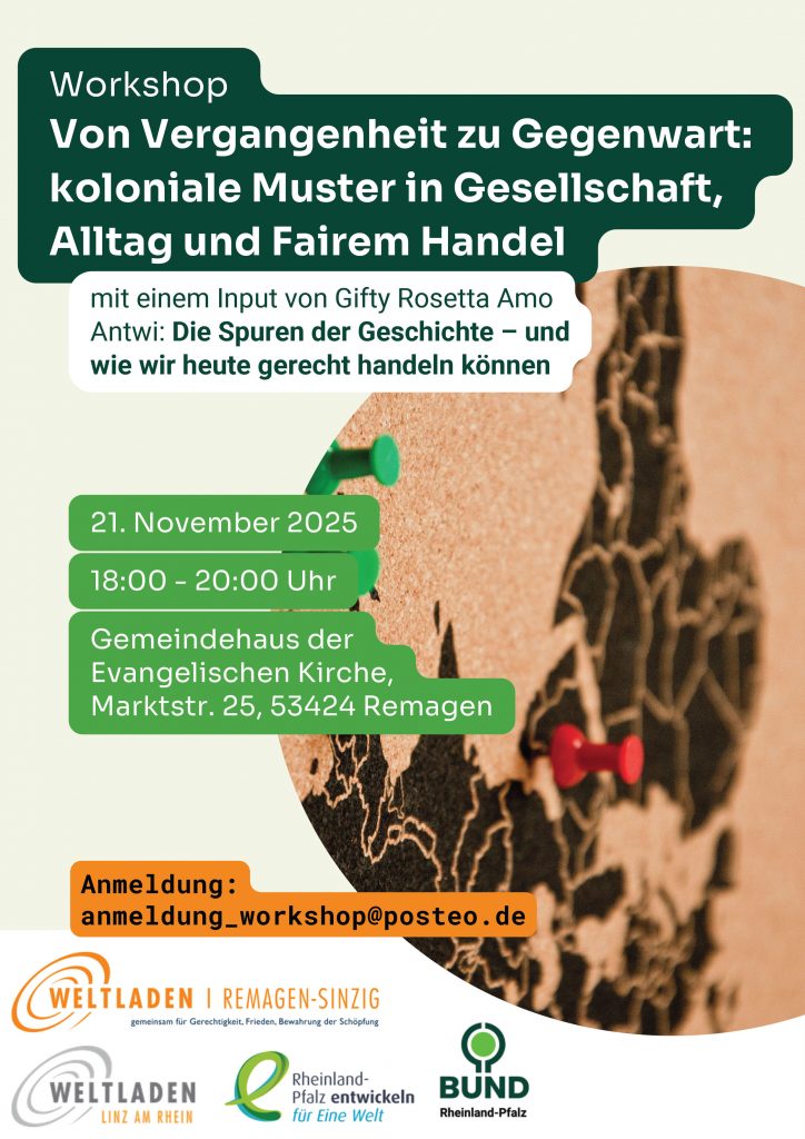 Hiermit laden wir herzlich zum Workshop „Von Vergangenheit zu Gegenwart: koloniale Muster in Gesellschaft, Alltag und Fairem Handel“ ein. Mit Impulsen zur Reflexion kolonial geprägten Ungleichheiten in Gesellschaft, im persönlichen Alltag sowie im Fairen Handel wollen wir uns dem Thema gemeinsam nähern und Raum für Austausch schaffen.
